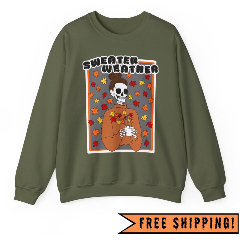Cozy up in spooky-season style with a playful twist. This forest green cotton crewneck sweatshirt features an adorable skeleton girl wearing a chunky fall sweater, holding a steaming cup of coffee, surrounded by colorful autumn leaves drifting through the air. Above the whimsical illustration, cute bubble lettering reads “Sweater Weather”, perfectly capturing the warm, cozy vibes of fall.